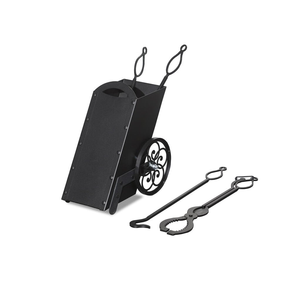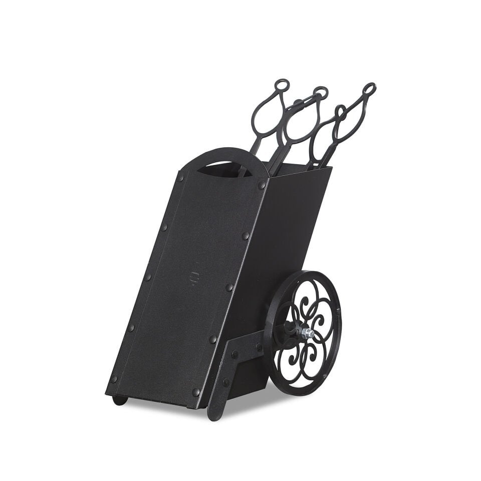 Praktisches und dekoratives Kaminset, bestehend aus Zangen, Schaufeln, Besen und Rührstäbchen, hergestellt aus speziell entwickeltem dickgefülltem Eisenmaterial und mit einer Metallbox auf Rädern, in der sie platziert werden.
